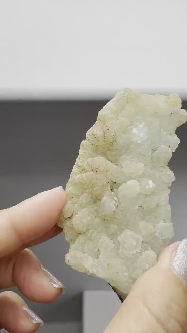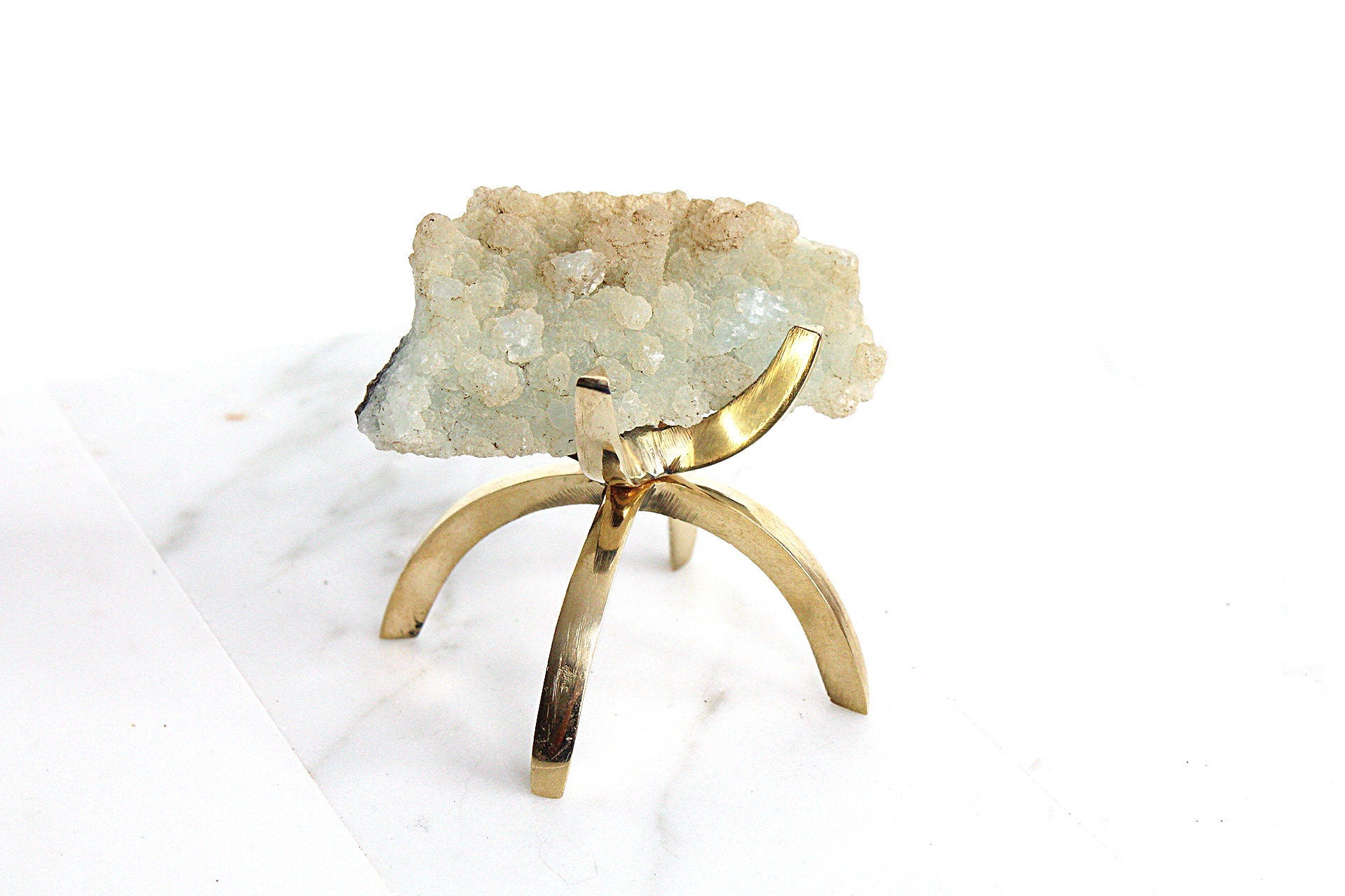Transform your living space with boho home decor featuring raw Prenhite Quartz Crystal elegantly showcased on a modern brass claw stand. Embrace the serene allure of this green Quartz Crystal mineral, perfectly displayed on a modern claw stand for a harmonious blend of natural beauty and contemporary design.