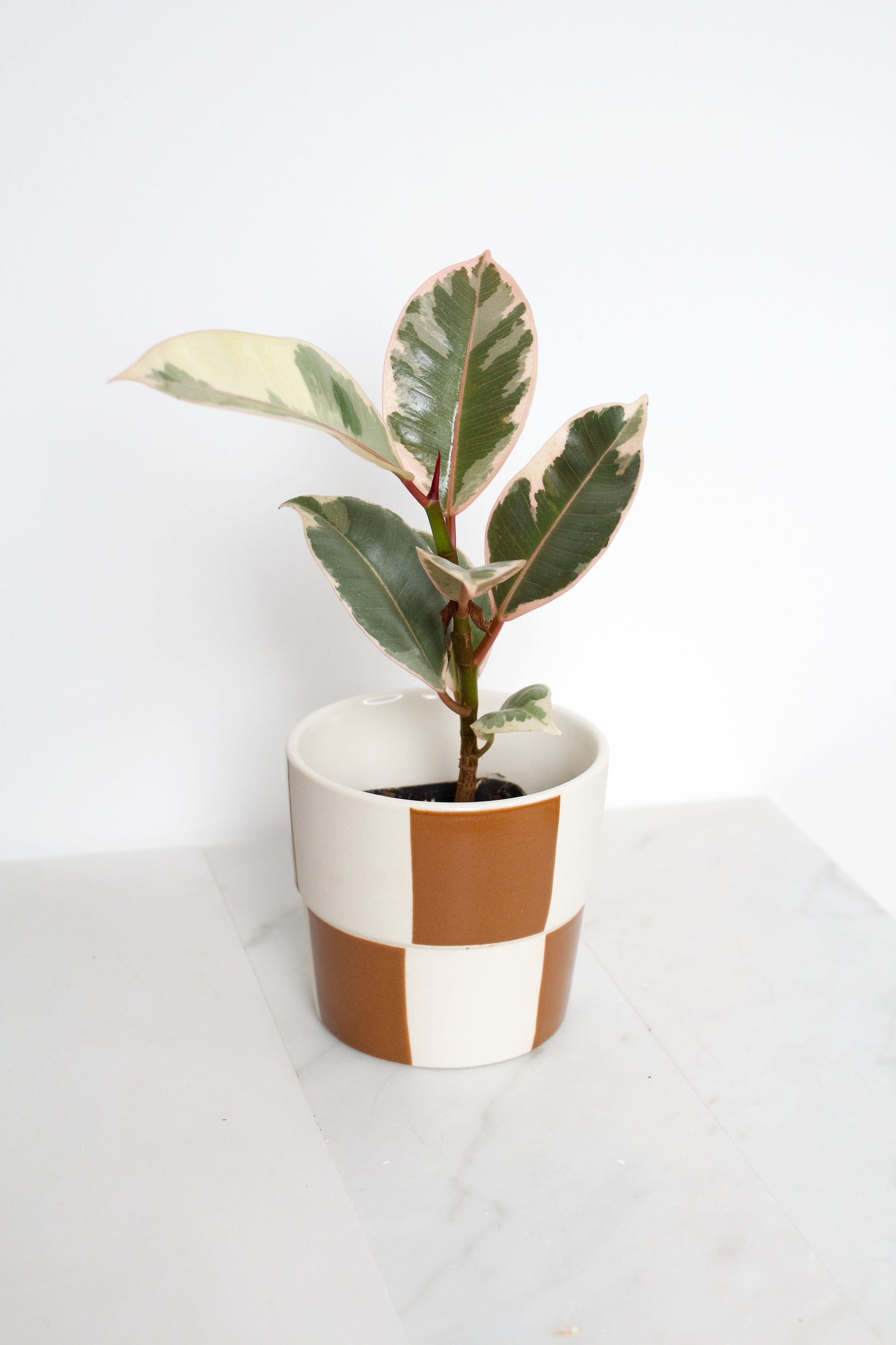 Trendy and cute. This little pot will add a little pizzazz to your shelf. Brown and white checkerboard pattern glazed on a ceramic pot.