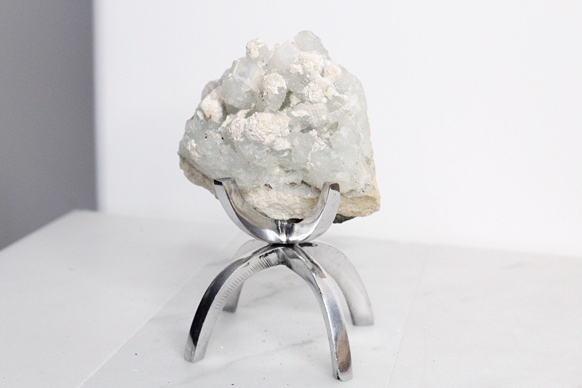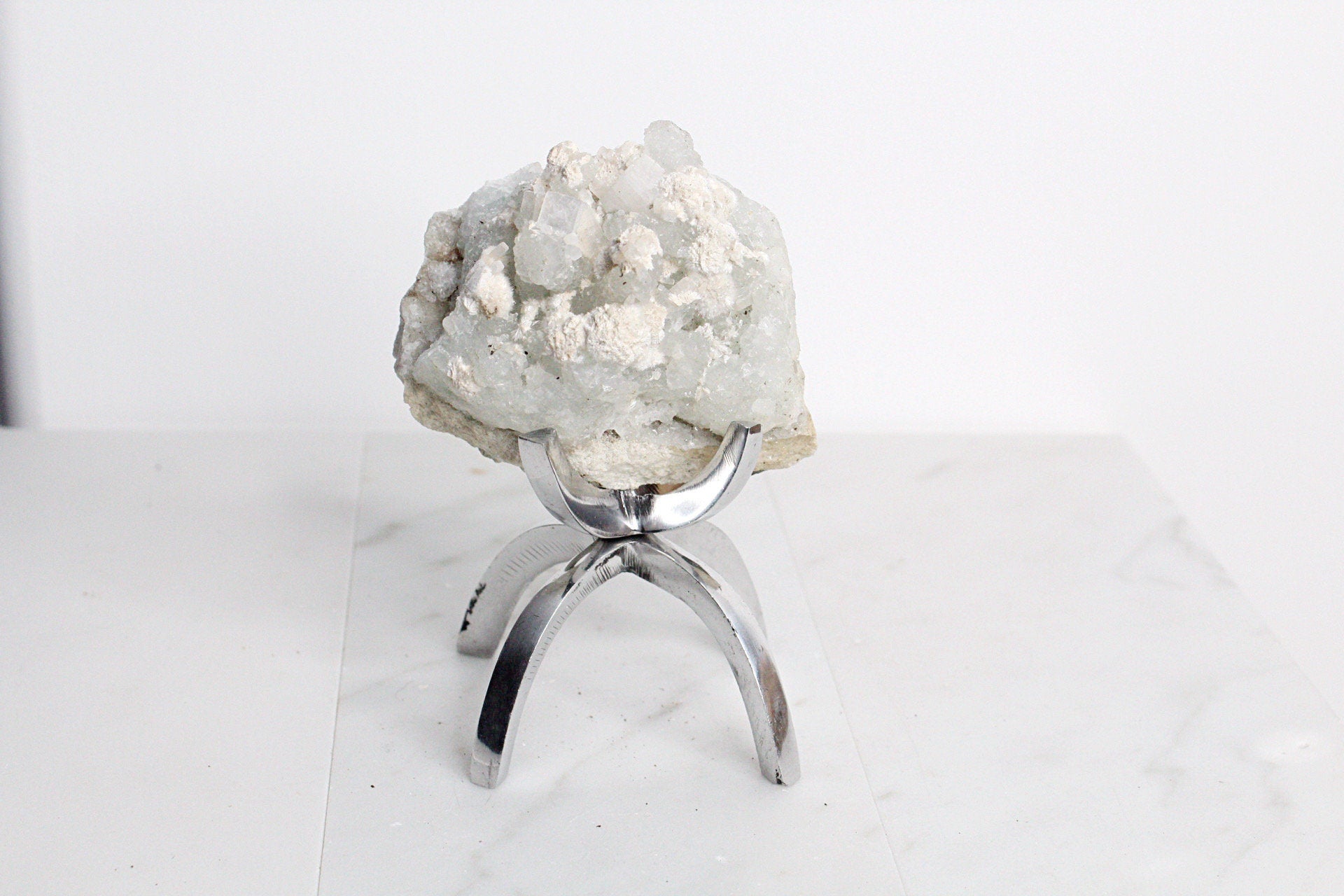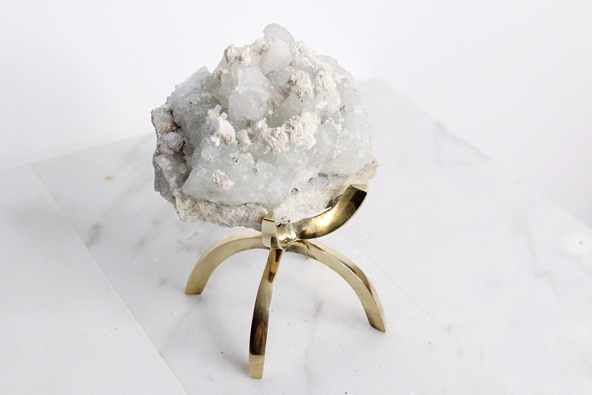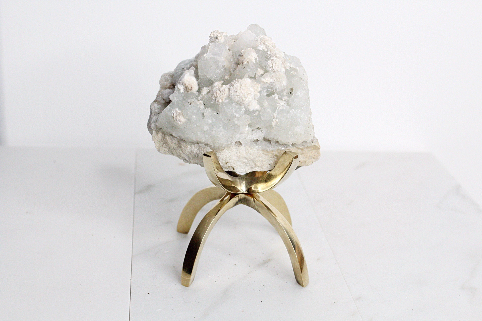Transform your space with boho crystal decor featuring Apophyllite Okenite Quartz Crystal elegantly presented on a modern brass claw stand-a distinctive arrangement that seamlessly integrates the serene beauty of Apophyllite Gray Quartz Crystal Mineral into your modern decor. Embrace the unique fusion of boho aesthetics and modern elegance, creating a captivating atmosphere in your living space.