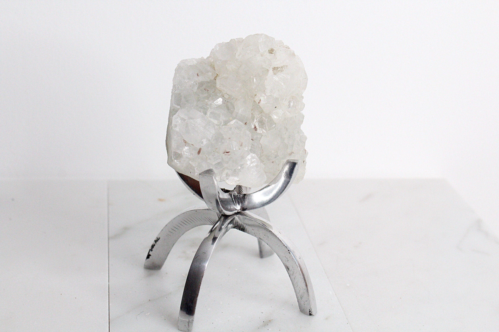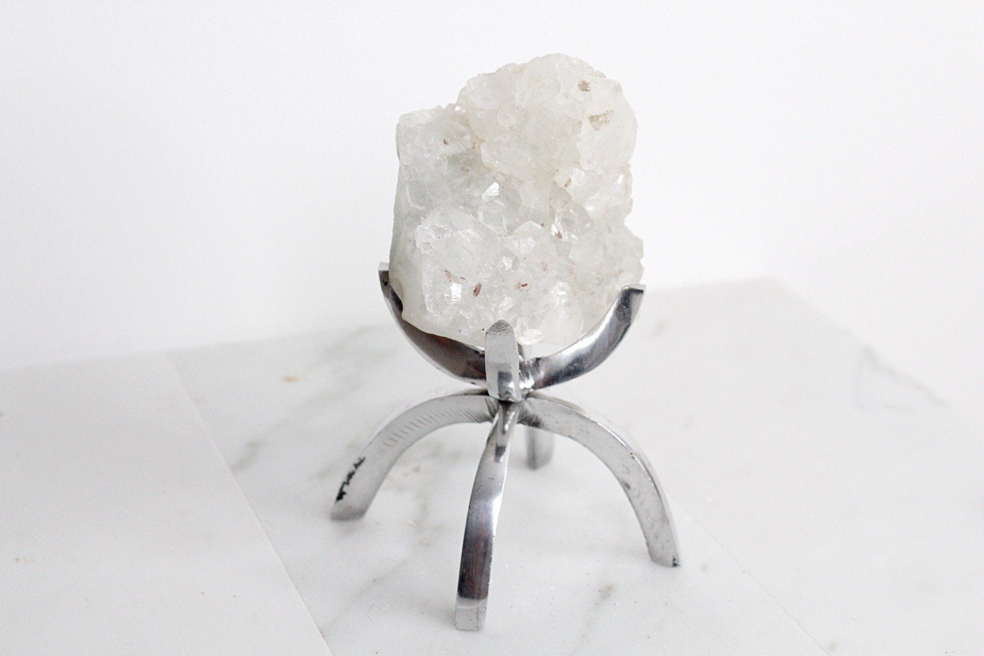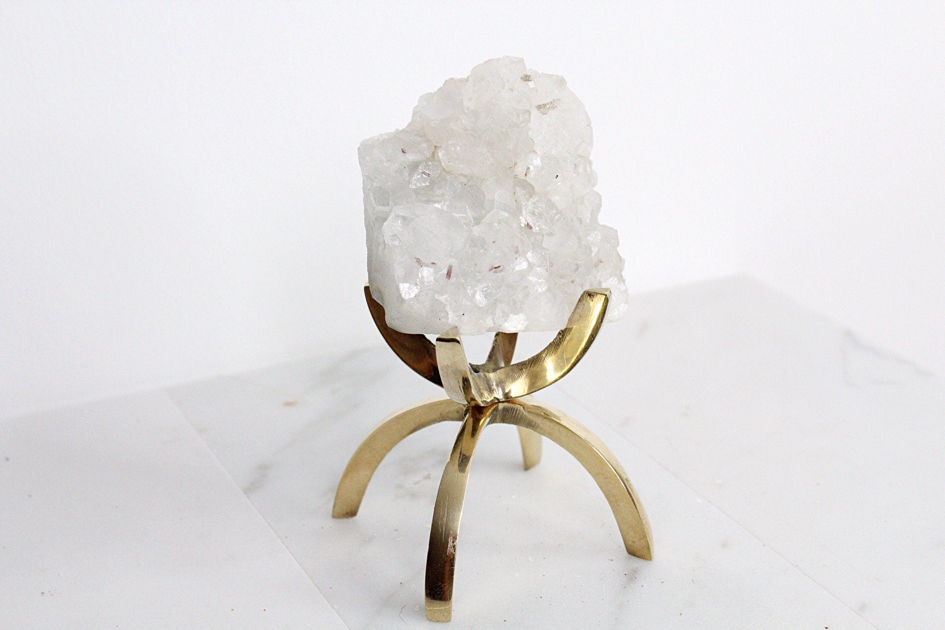 Enhance your space with a boho decor accent featuring Apophyllite Quartz Crystal Mineral elegantly showcased on a brass modern claw display stand-a unique arrangement that adds a touch of elegance. Embrace the allure of this white quartz crystal, creating a captivating crystal mineral display, making it a perfect and thoughtful gift.