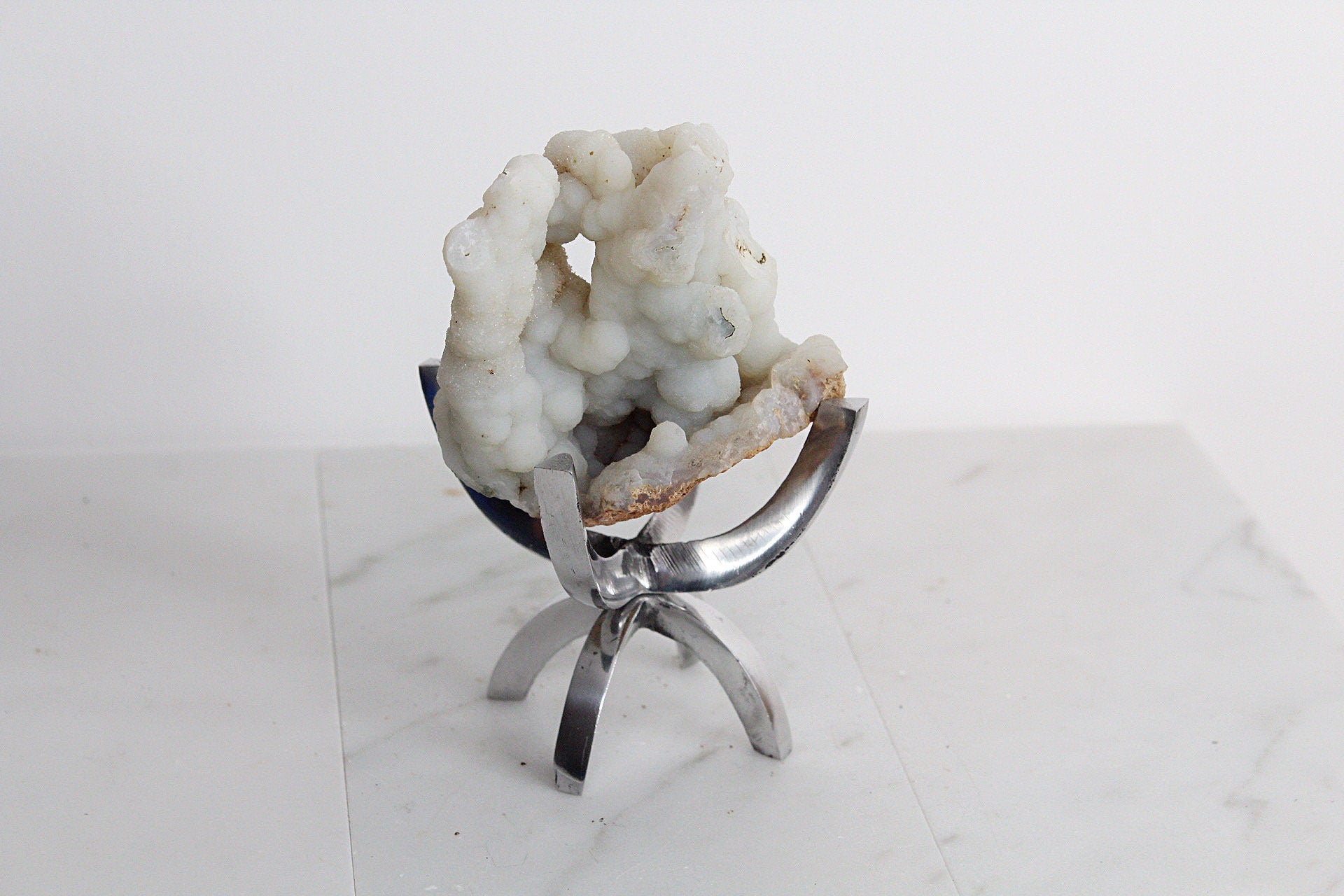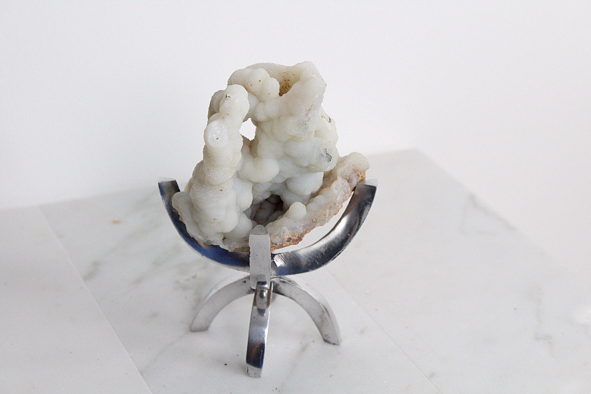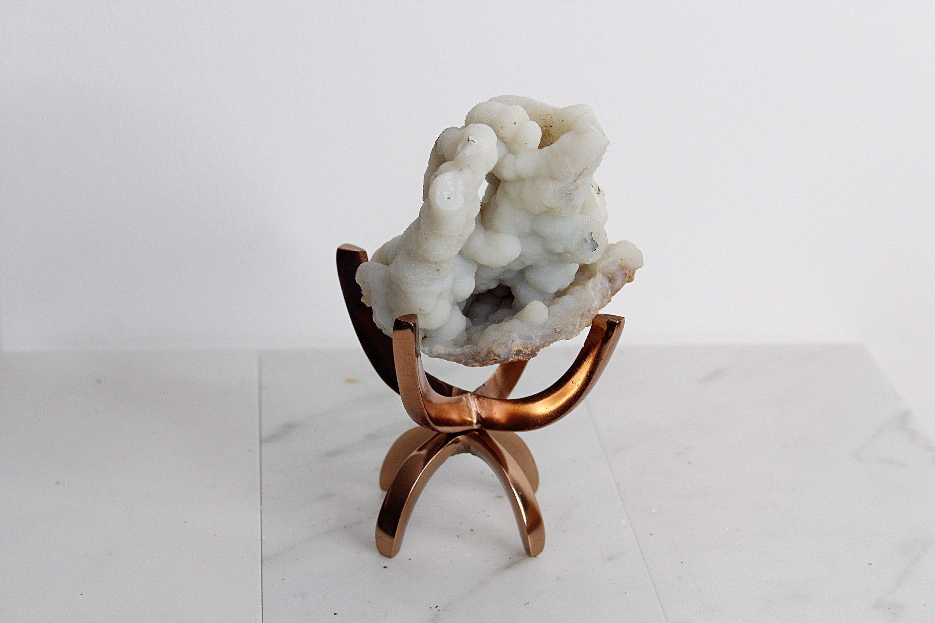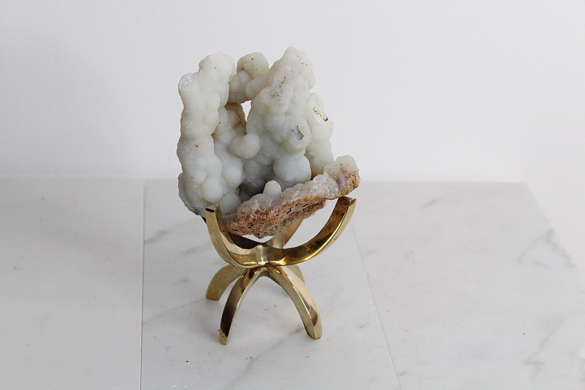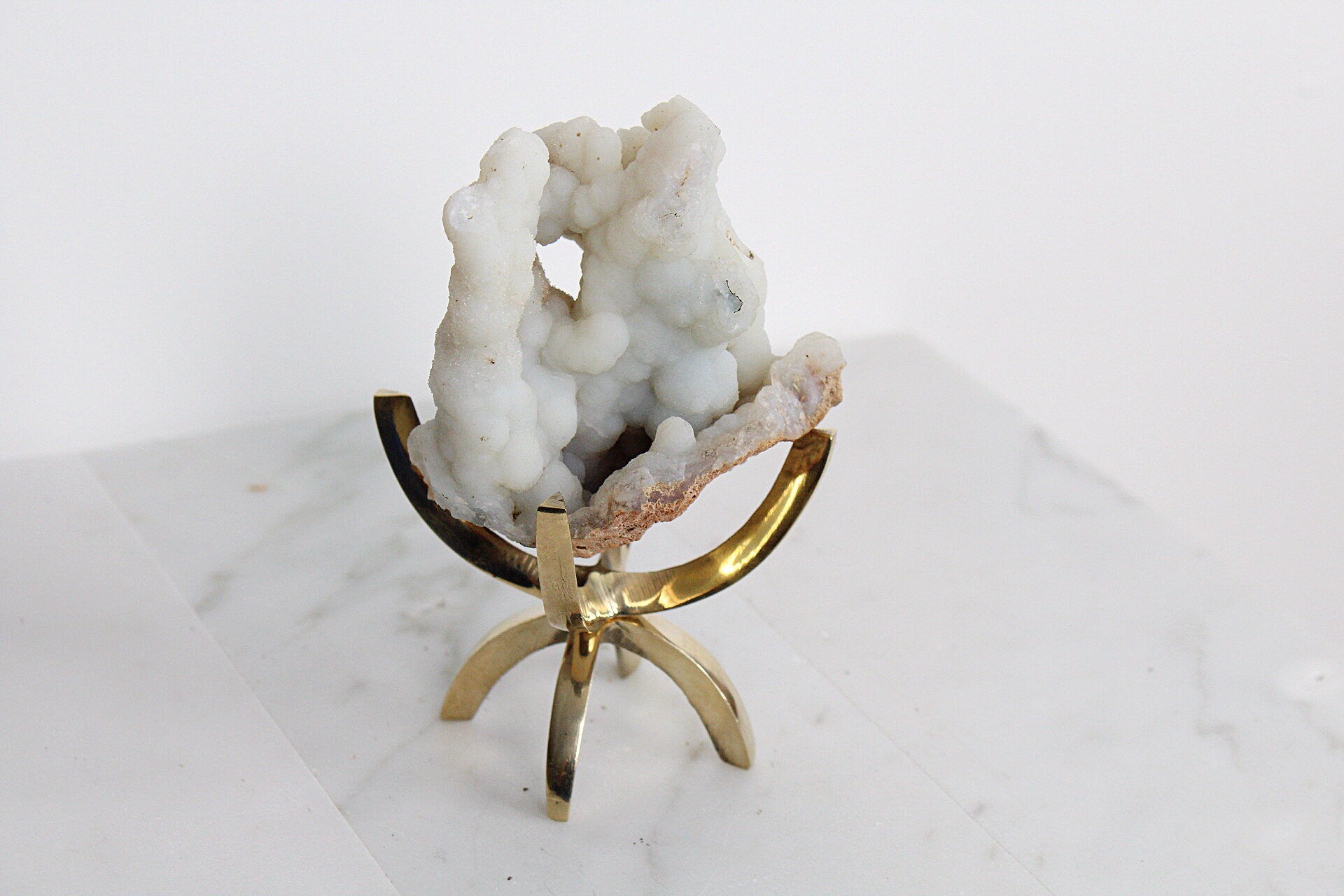 Elevate your home with a boho display accent featuring white Chalcedony Quartz Crystal elegantly presented on a brass stand-a distinctive home accent that seamlessly blends elegance and boho vibes. Embrace the enchanting allure of Chalcedony Mineral showcased on the brass modern claw display stand, creating a harmonious boho decor in your space.
