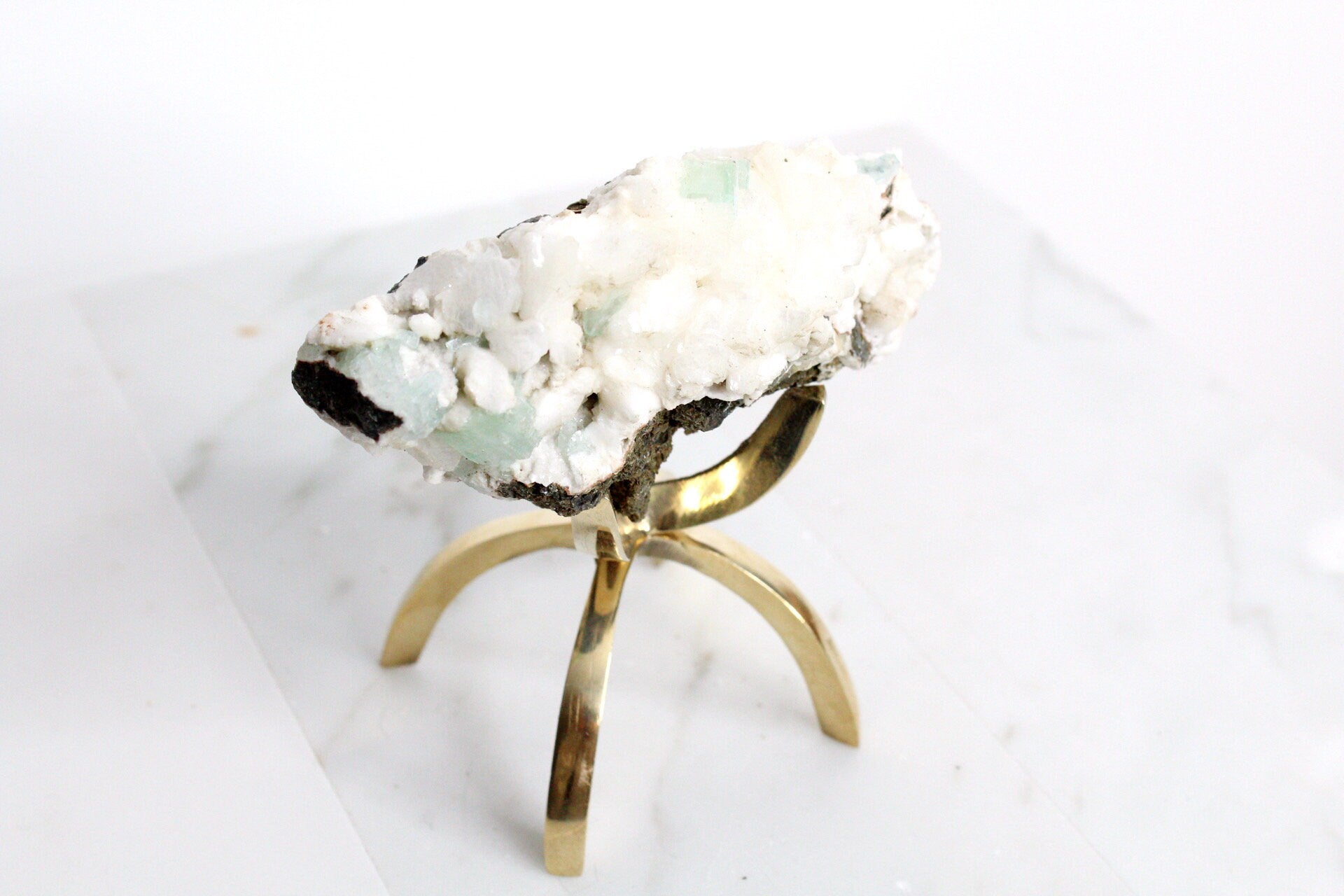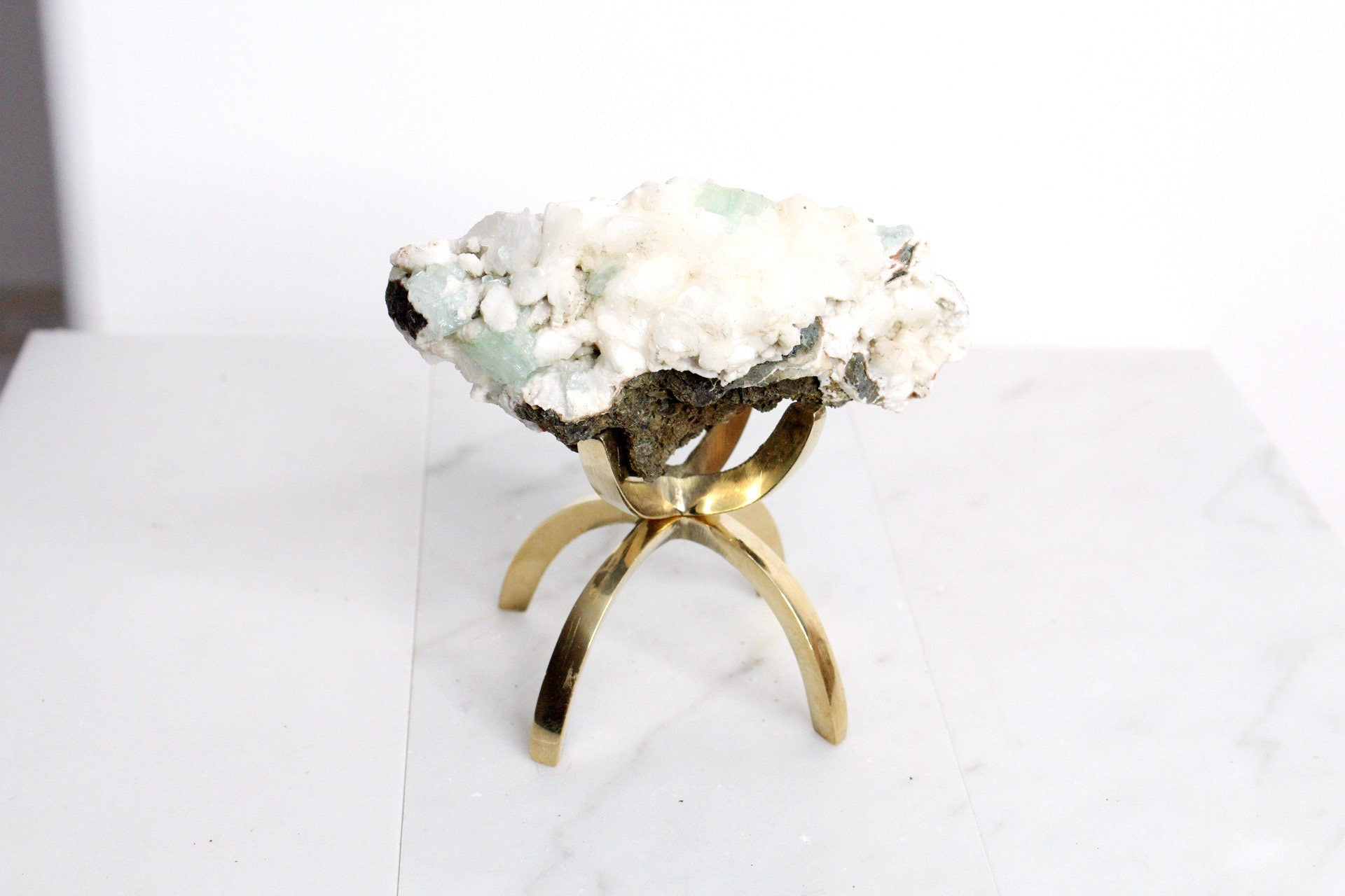 Revitalize your space with a modern decor accent featuring Heulandite Apophyllite Quartz Crystal Mineral elegantly displayed on a brass modern claw display stand-a distinctive arrangement that seamlessly blends the allure of crystal mineral display into your boho crystal decor. Embrace the harmonious fusion of Heulandite Apophyllite, the modern brass claw display stand, and boho aesthetics, creating a captivating atmosphere in your living space.