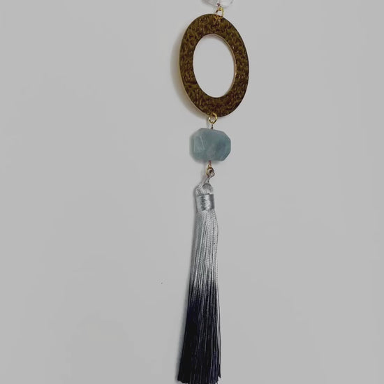 Give love and positive vibes with this sun catcher. This is a minimally chic wall hanging art made of brass accents, aquamarine, and clear quartz beads. These beads are artfully linked together with brass chain and hung from a thin brass hoop. The piece is finished with a gray ombre dyed tassel. This wall art can be placed on a wall near a bed, in the living room, or mixed in an collage of frames.