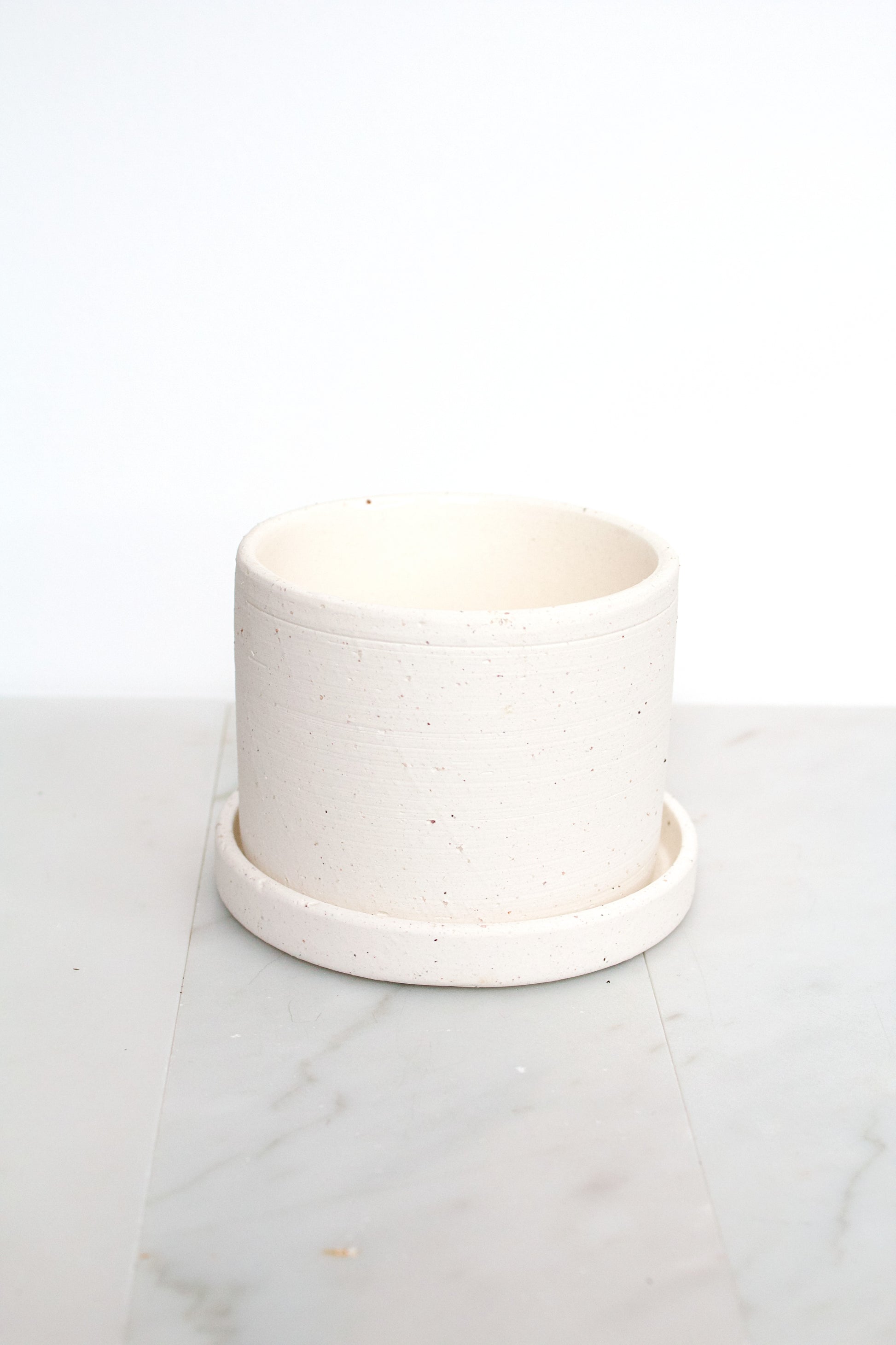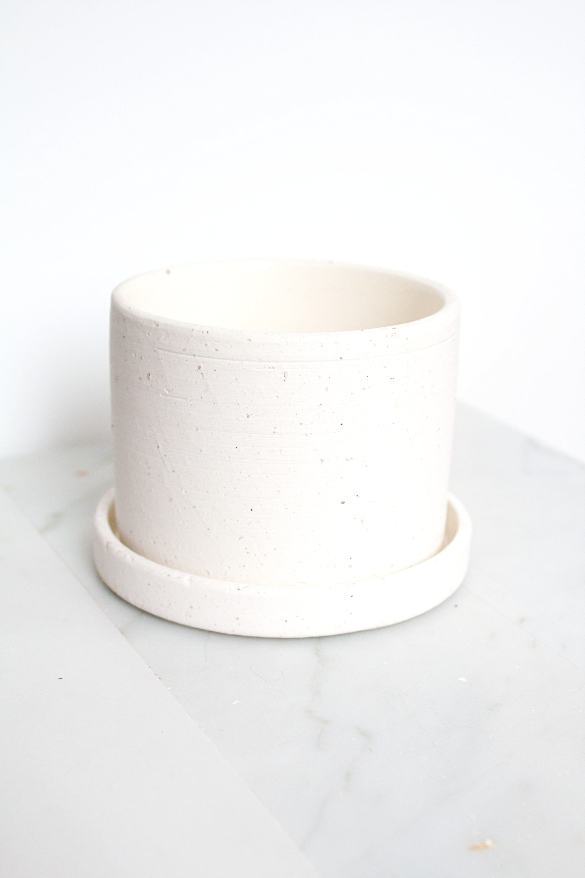 Nice off-white cream colored ceramic pot. Has a textured surface to give a rustic feel. Would work great with any color-scheme on your shelf. This pot has a drainage hole and coaster.
