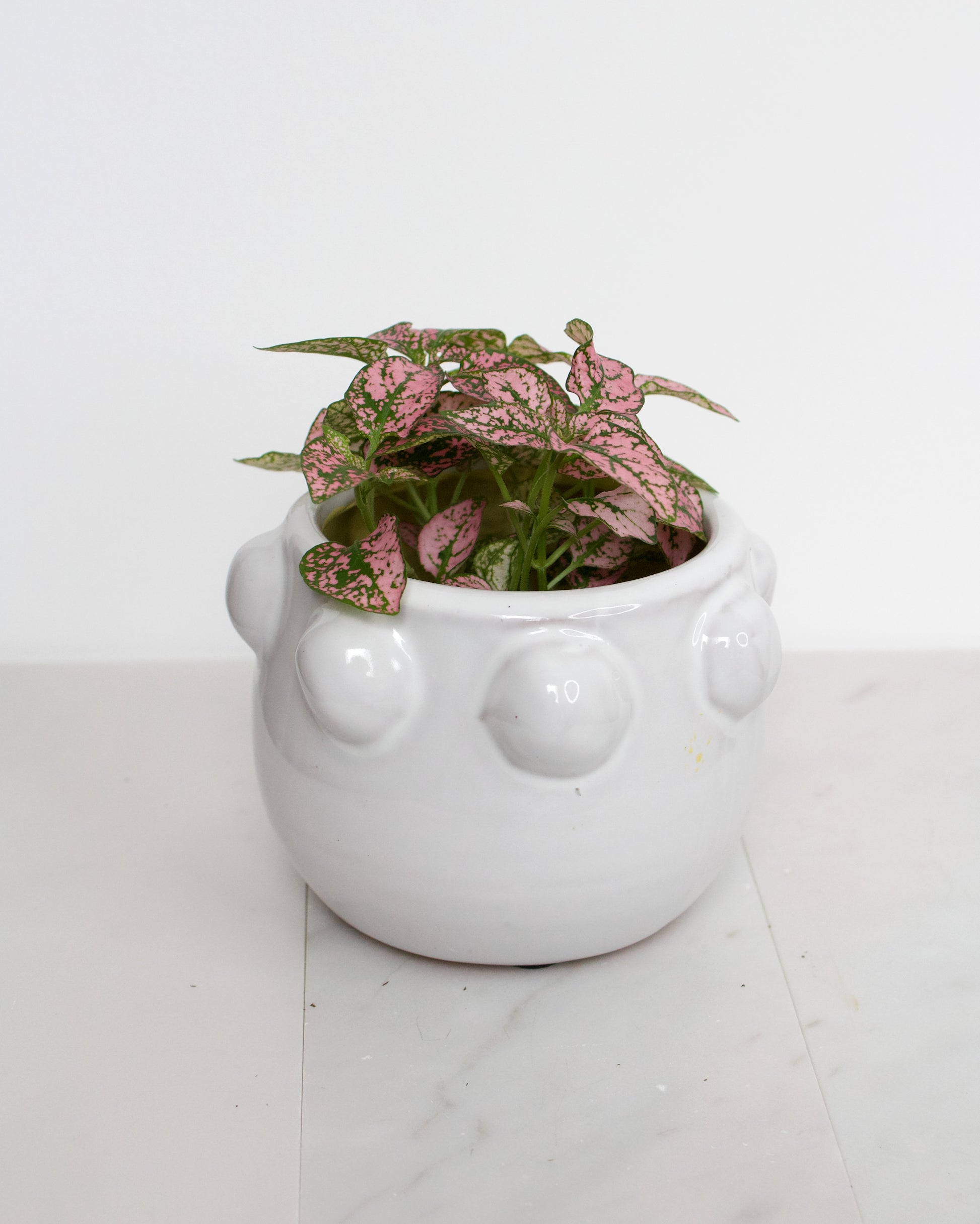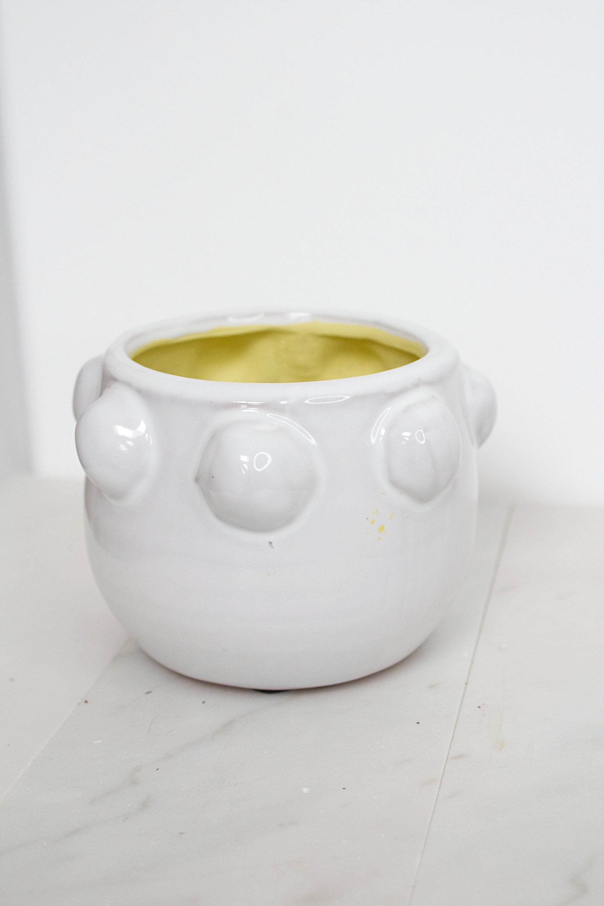Grab this cute and trendy pot before it sells out. It is white glazed ceramic with dots along the upper rim. Would look great on any table top or shelf to make your plants pop.