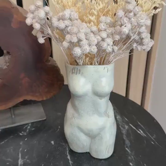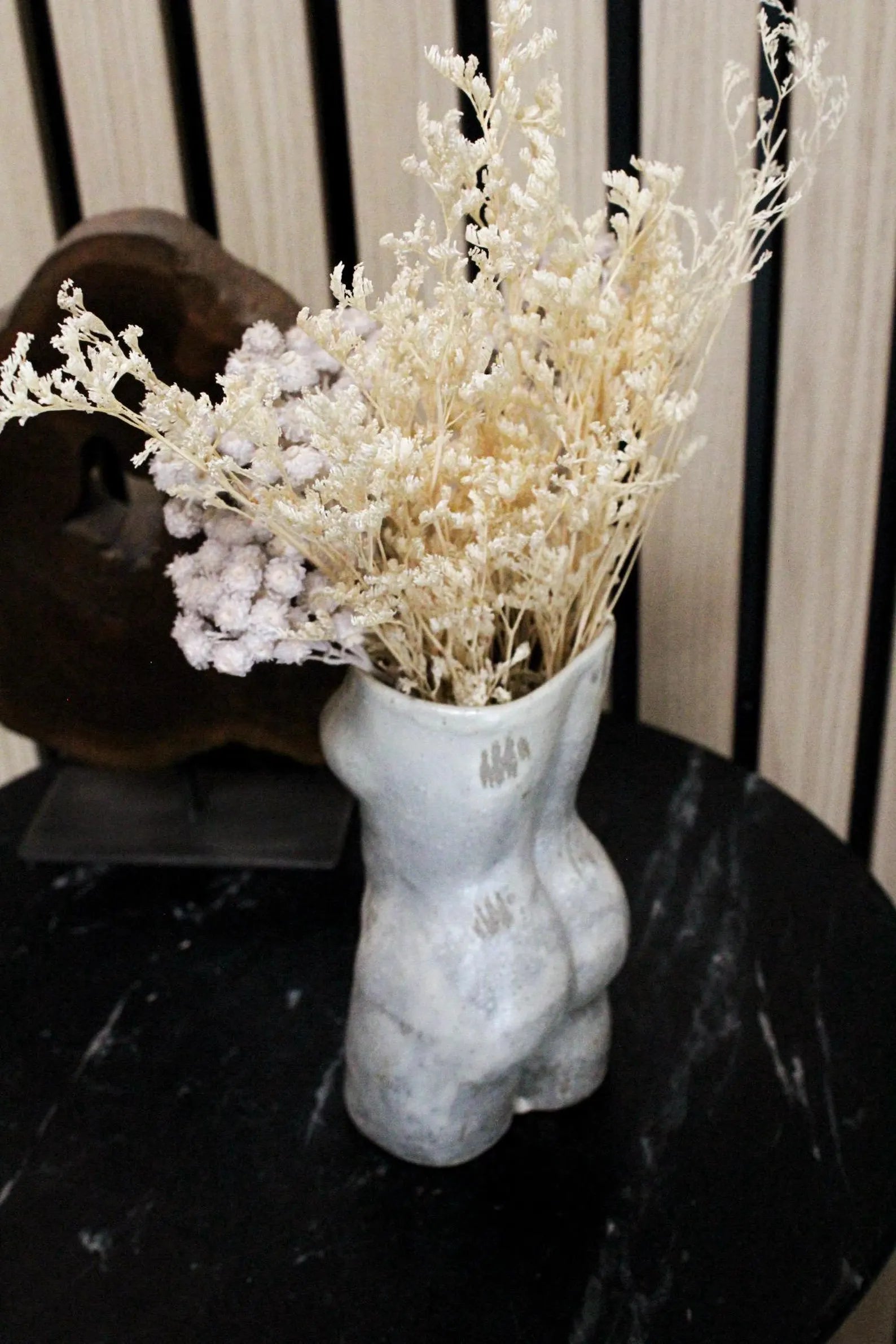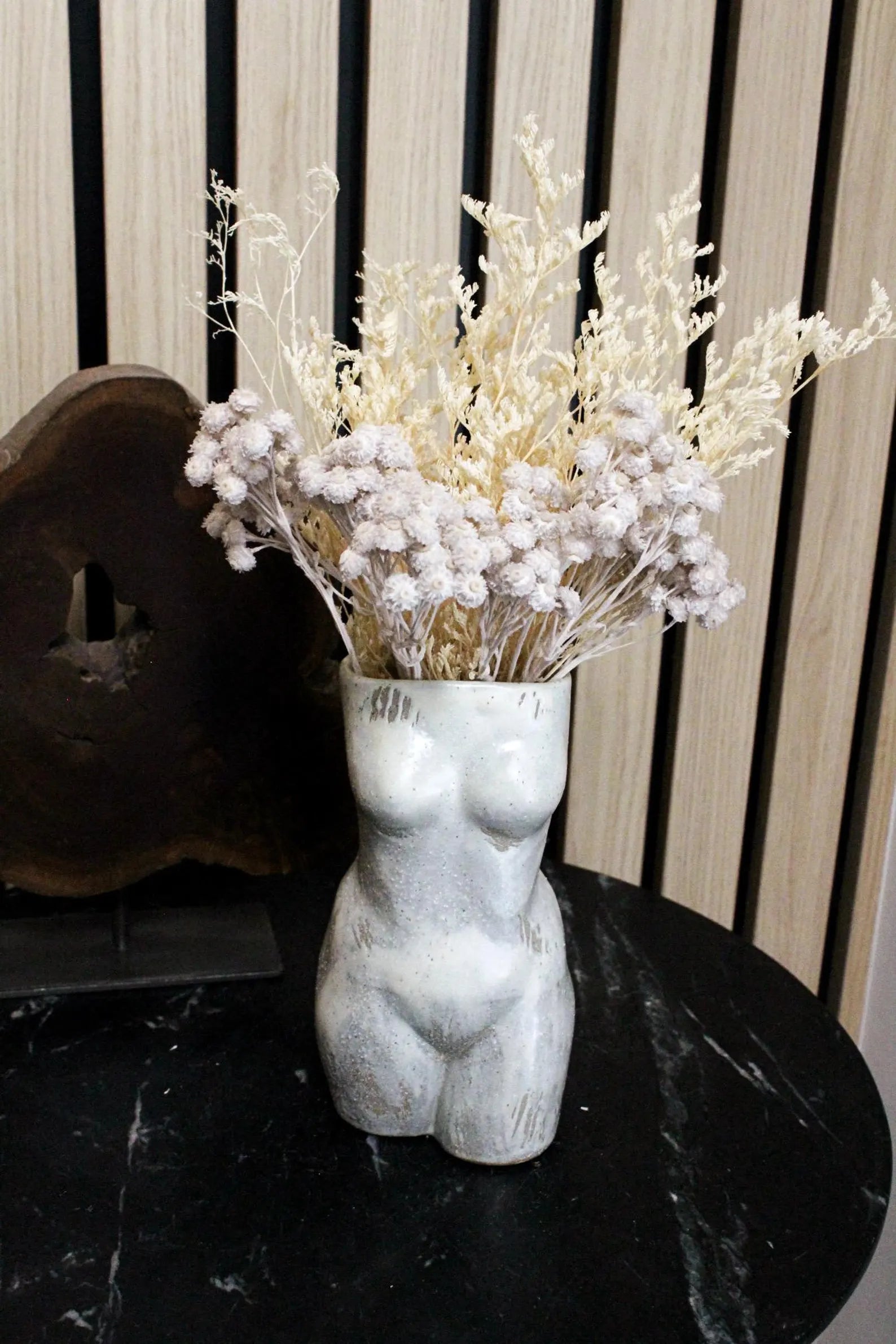 Elevate your space with the Anora Vase, a striking female torso ceramic sculpture that blends art and function. Crafted from white ceramic with an intentionally distressed finish, this minimalist body vase subtly reveals the natural clay beneath—adding depth, texture, and artistic character to your décor.