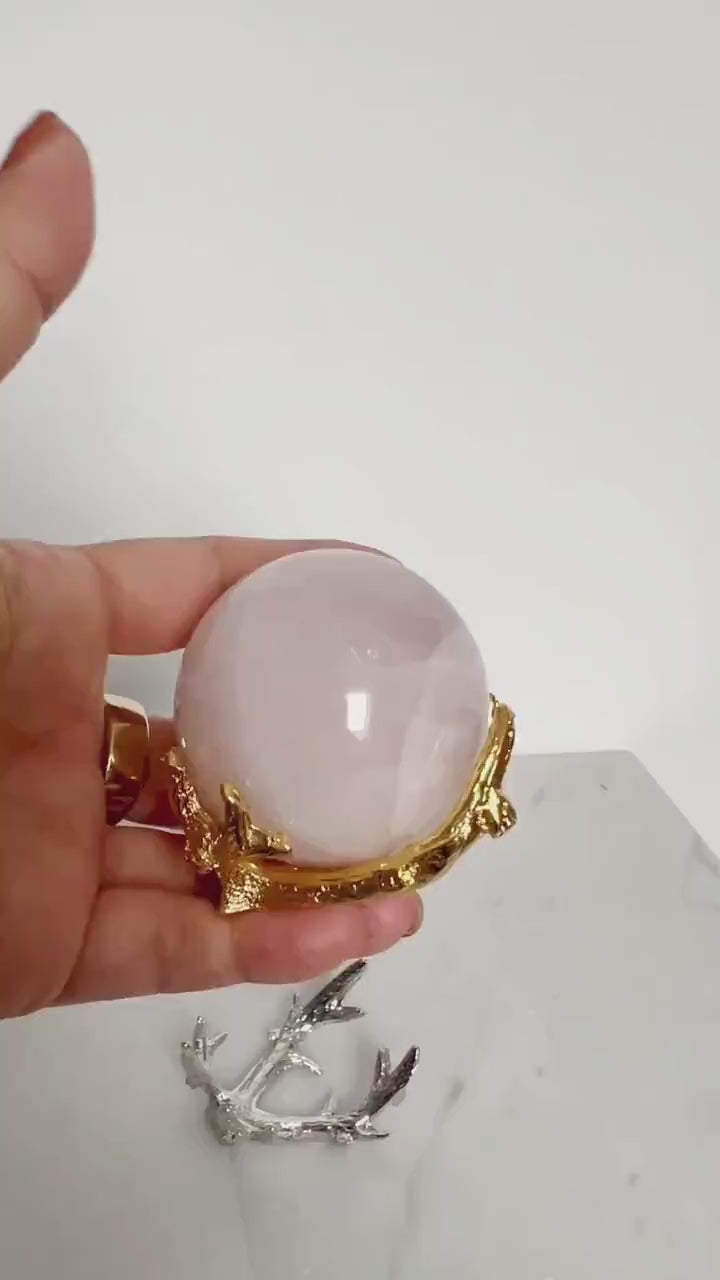 Elevate your Boho Home Decor with the stylish Gold Modern Crystal Sphere Display Stand, made of a base metal shaped as crossed elk antlers. This unique mineral display holder adds a touch of sophistication to your space, creating a harmonious blend of modern design and natural elements.