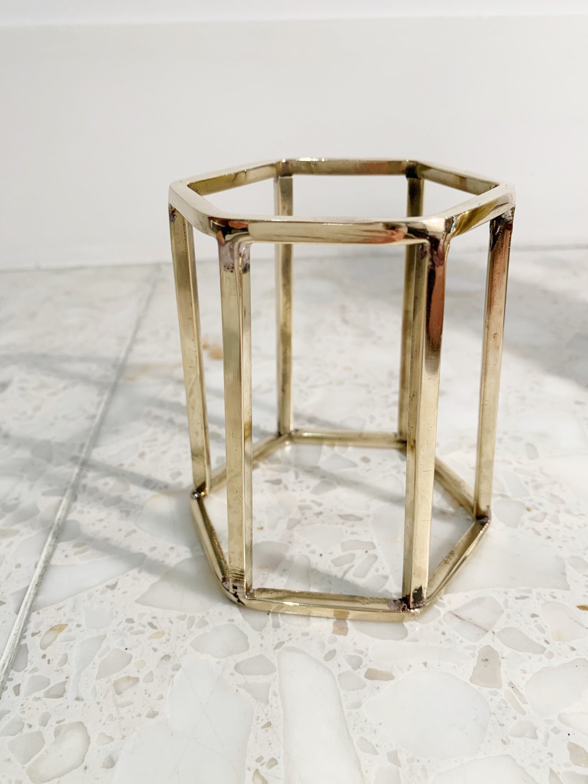 Defy gravity and use this brass to suspend your favorite crystal. The brass hexagonal pedestal will add a chic and modern touch to your display shelf and height to your favorite crystals. It can also be used to air-plants.
