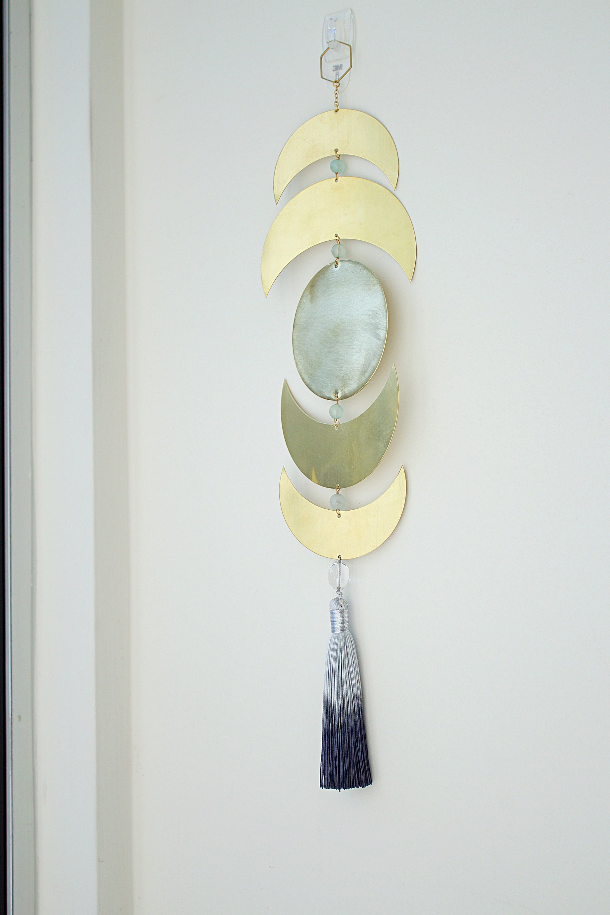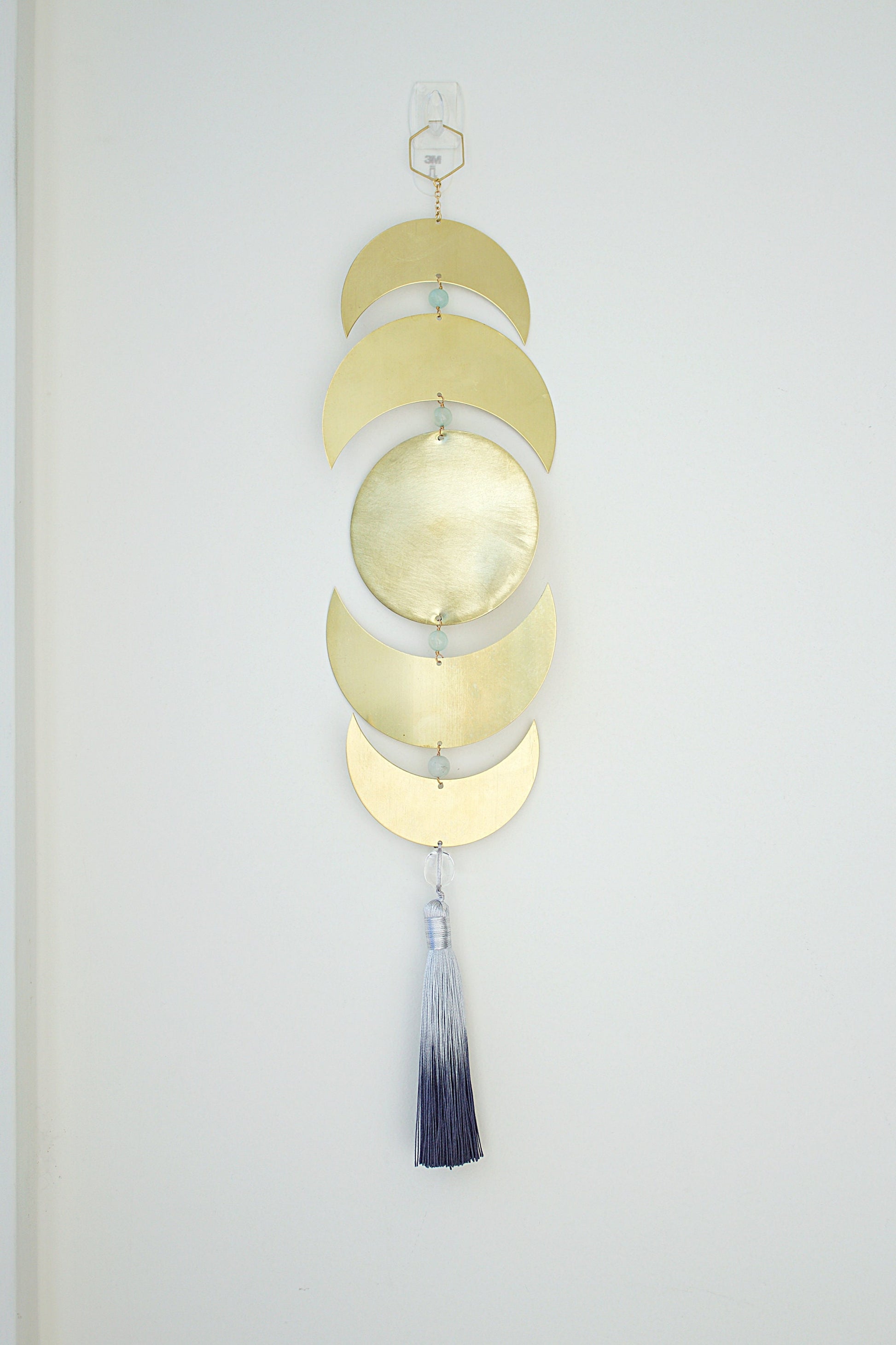 Decorate your space with this handcrafted brass art piece. This is a minimally chic wall art made of brass crescents/moon with aquamarine, clear quartz crystal, and finished with a ombre gray tassel. These pieces are wire wrapped together and hung from a thin brass hoop. This wall art can be placed on a wall near a bed, in the living room, or mixed in an collage of frames.