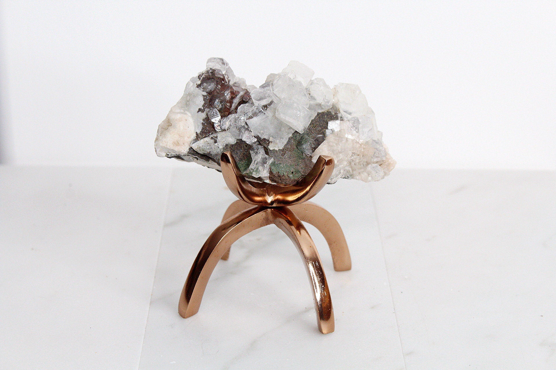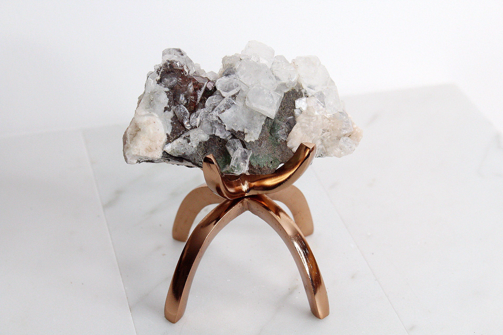 Stand Options: brass, rose gold colored or silver colored aluminum display stand that is 2.25 inches wide and 2.5 inches tall. The stand adds a little bit of modern and add depth to your collection of crystals by changing up the height.