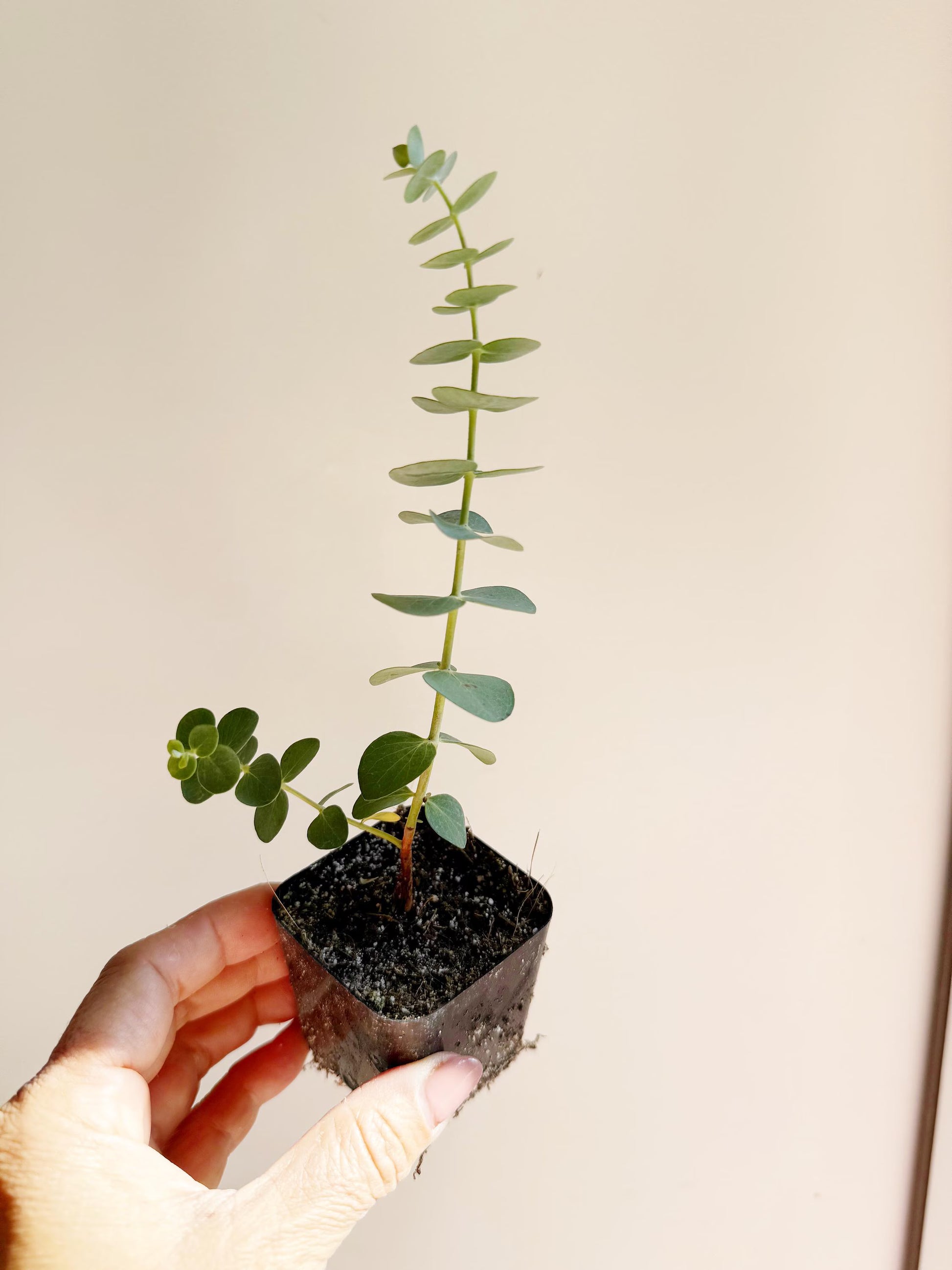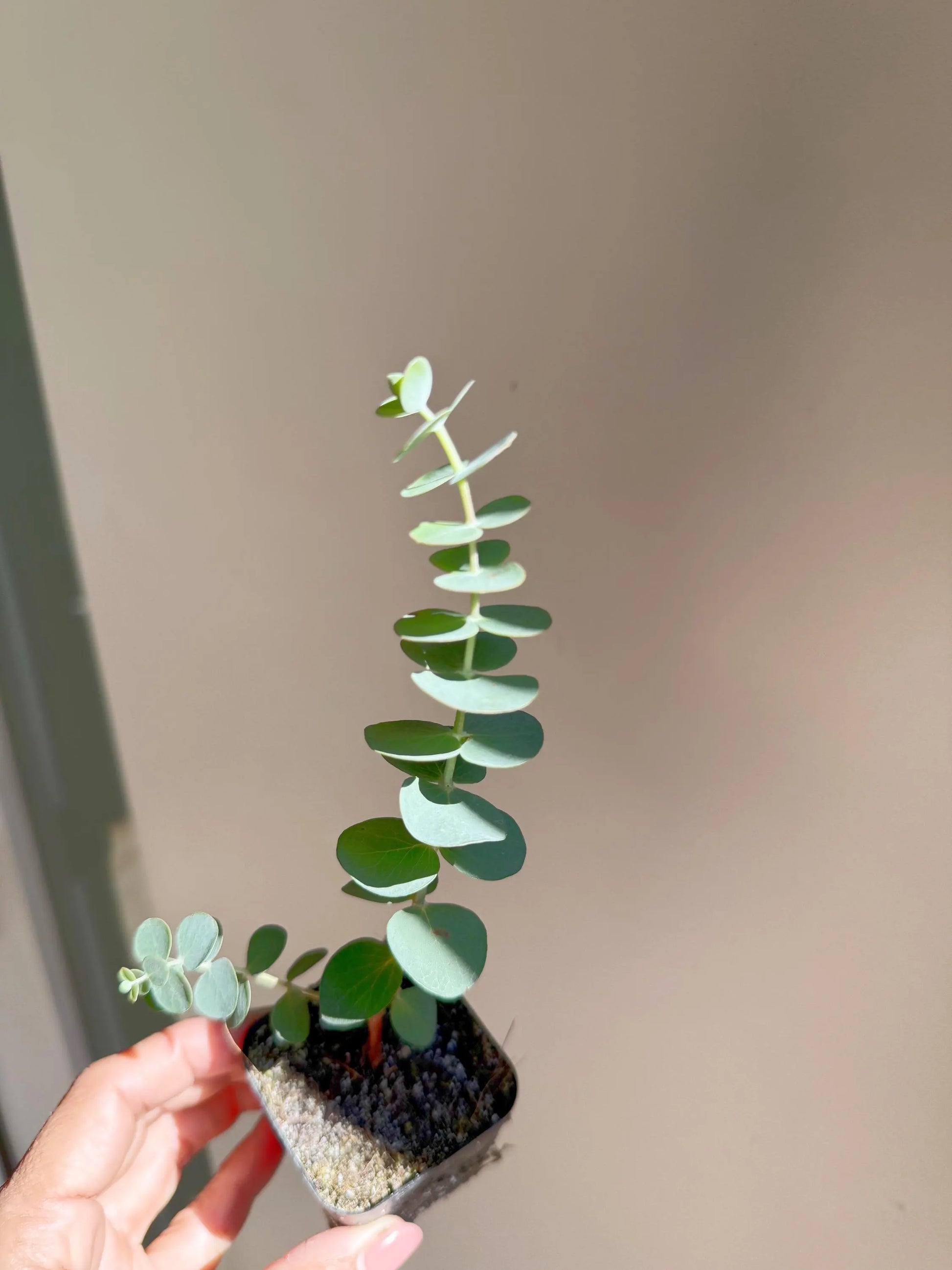 Young Spiral Eucalyptus starter plant, 5-6 inches tall in a 2-inch pot, perfect for establishing in your garden