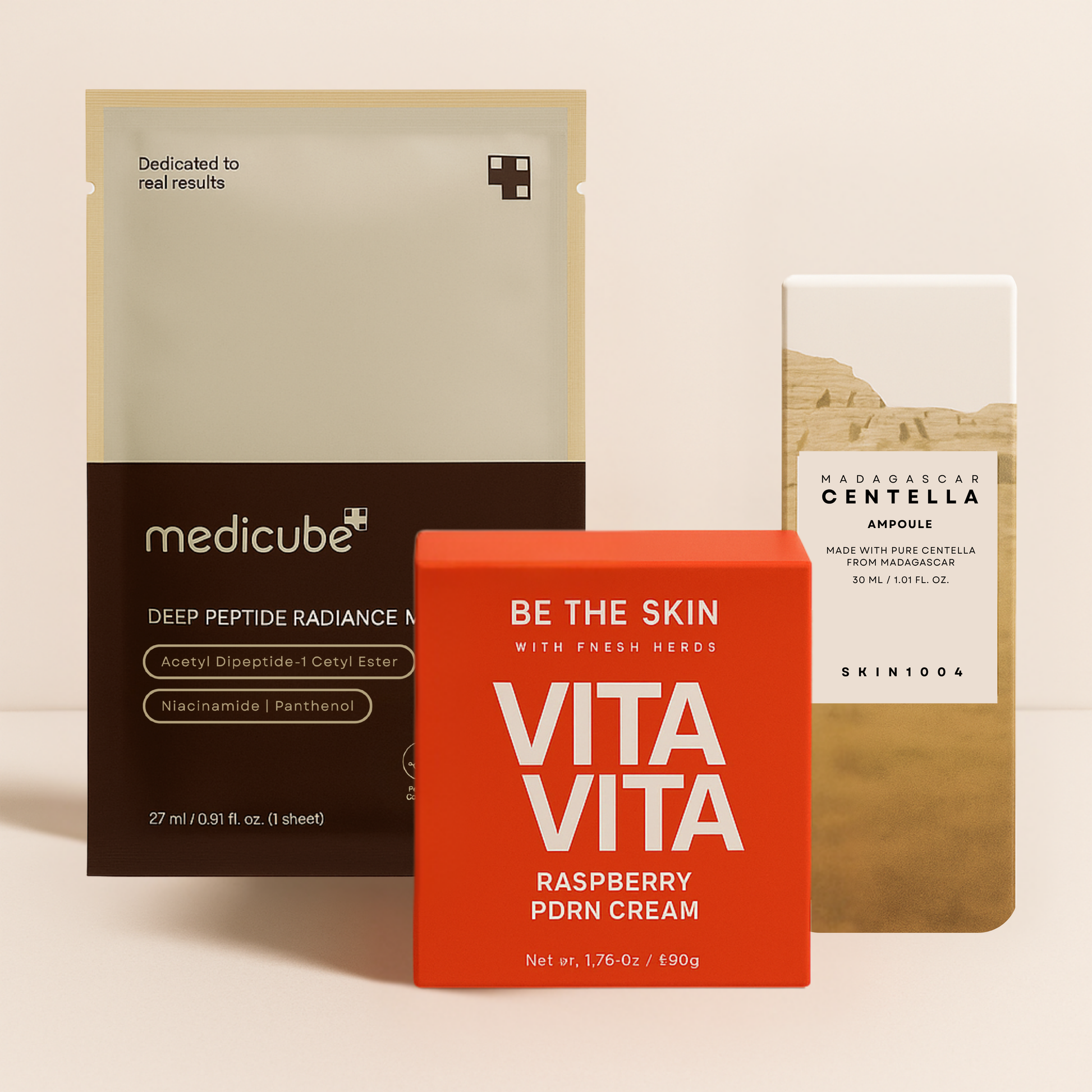 3-piece premium skincare set featuring a deep peptide mask, nourishing PDRN cream, and soothing Centella ampoule